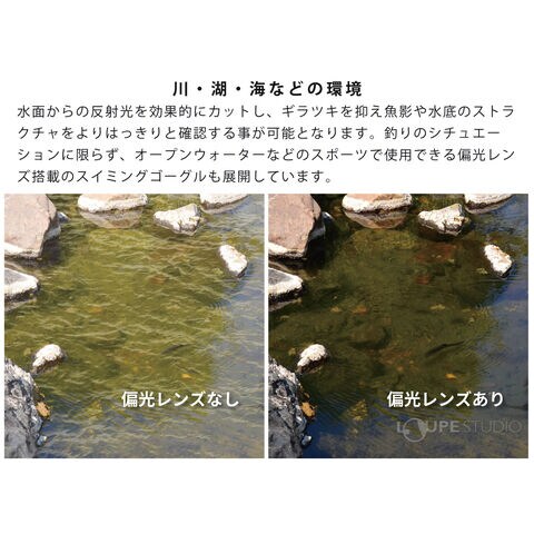 - レンズに特殊なフィルターが挟み込まれたレンズです。日光が水面や路面、植物の葉の表面などに反射したギラギラした反射光をカットします。余計な光をカットして景色をスッキリと見せる効果があります。