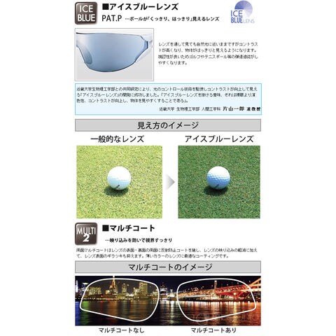 偏光アイスブルーレンズは、コントラストが強調され、視認性を必要とするボールスポーツなどに最適なレンズカラー。特にゴルフやテニスでのボールやラインの認識に効果的で、トッププロも愛用する高機能レンズです。
