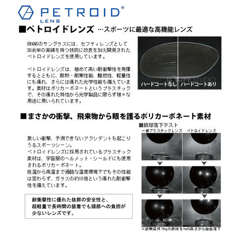 耐衝撃・対擦傷性に優れた「PETROID LENS(ペトロイドレンズ)」を使用。 宇宙服のヘルメットシールドにも使用され、ガラスの10倍以上という耐衝撃性を持つプラスチック素材「ポリカーボネート」を使用し、激しい衝撃や予測できないアクシデントも起こりうるスポーツシーンで眼を護ります。さらに独自のハードコート膜で表面の傷も防ぎます。