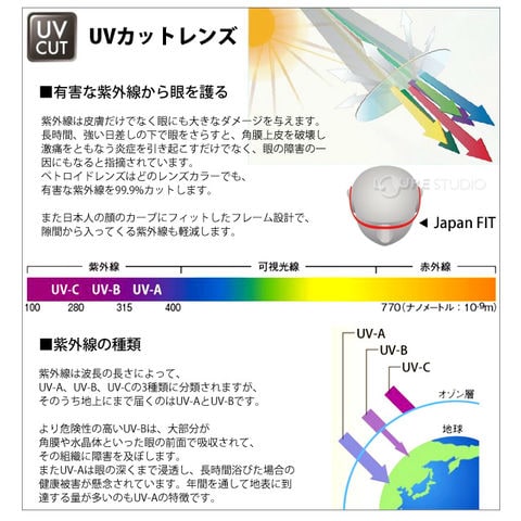 SWANSサングラスはすべてのレンズが有害な紫外線を99.9%以上カットします。 長時間強い日差しの下で眼をさらすと、眼の障害の一因にもなると指摘されている紫外線。SWANSペトロイドレンズは、どのレンズカラーでも紫外線を99.9%以上カットし、日本人の顔のカーヴにフィットしたフレーム設計で隙間から入ってくる紫外線も軽減します。
