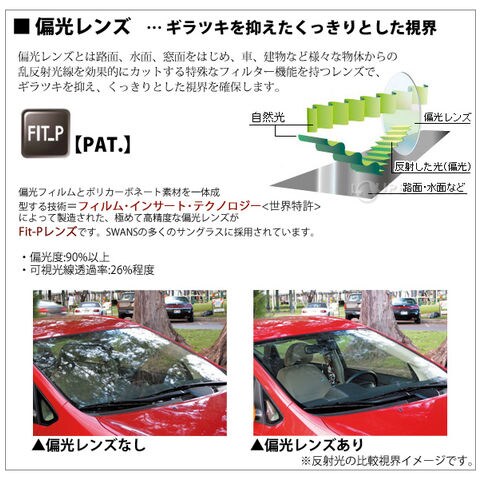 SWANSサングラスはすべてのレンズが有害な紫外線を99.9%以上カットします。長時間強い日差しの下で眼をさらすと、眼の障害の一因にもなると指摘されている紫外線。SWANSペトロイドレンズは、どのレンズカラーでも紫外線を99.9%以上カットし、日本人の顔のカーヴにフィットしたフレーム設計で隙間から入ってくる紫外線も軽減します。