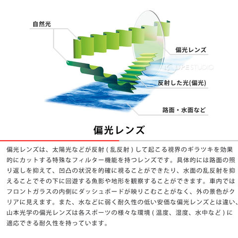 | レンズ機能 | ULTRA LENS(ウルトラレンズ)→見たい部分を強調できる高視認性レンズ 偏光レンズ→路面や水面からの反射(ギラツキ)をカットするレンズ PETROID LENS(ペトロイドレンズ)→ポリカーボネート素材に、キズに強いコーティングを施したレンズ 両面マルチコートレンズ |