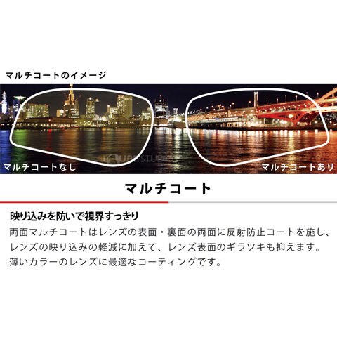 ギラギラした反射光をカットし、水面や路面の照り返しをカット。緑の多い景色などでは、スッキリした視界になる偏光レンズです。さらに、両面反射防止のマルチコートを施すことで日陰や室内などでのレンズへの映り込みを抑えた機能性レンズ。偏光アイスブルーレンズは、コントラストが強調され、視認性を必要とするボールスポーツなどに最適なレンズカラー。特にゴルフやテニスでのボールやラインの認識に効果的で、トッププロも愛用する高機能レンズです。