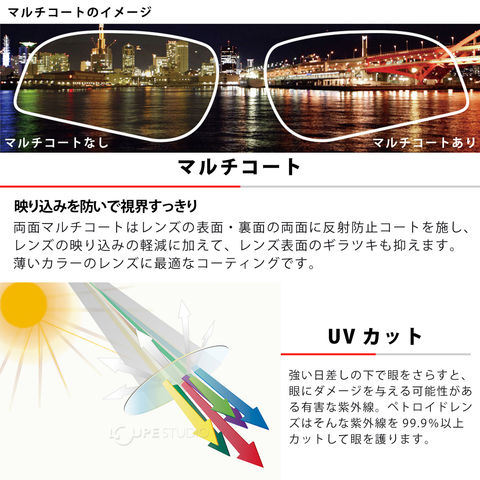 | レンズ機能 | ULTRA LENS(ウルトラレンズ)→見たい部分を強調できる高視認性レンズ PETROID LENS(ペトロイドレンズ)→ポリカーボネート素材に、キズに強いコーティングを施したレンズ 偏光レンズ→路面や水面からの反射(ギラツキ)をカットするレンズ 両面マルチコート |