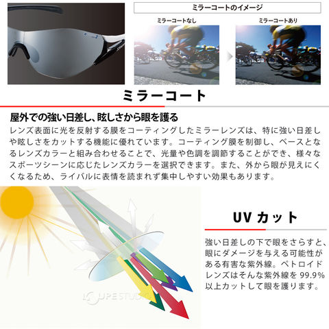 | レンズ機能 | ULTRA LENS(ウルトラレンズ)→見たい部分を強調できる高視認性レンズ PETROID LENS(ペトロイドレンズ)→ポリカーボネート素材に、キズに強いコーティングを施したレンズ ミラーコート 裏面マルチコート |
