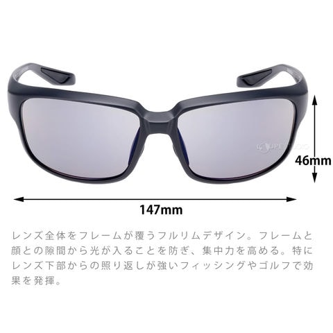 レンズ全体をフレームが覆うフルリムデザイン。フレームと顔との間の隙間から光が入ることを防ぎ、集中力を高める。特にレンズ下部からの照り返し光が強いフィッシングやゴルフで効果を発揮。