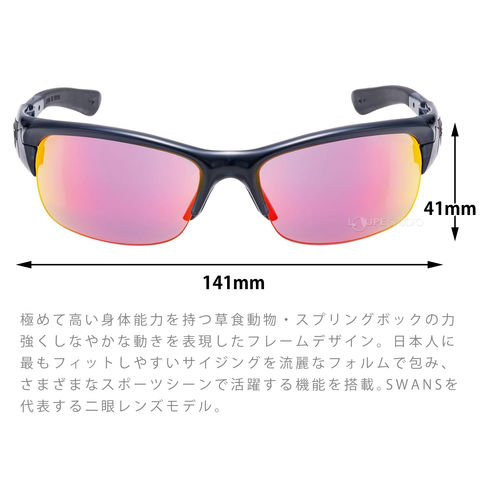 極めて高い身体能力を持つ草食動物・スプリングボックの力強くしなやかな動きを表現したフレームデザイン。日本人に最もフィットしやすいサイジングを流麗なフォルムで包み、さまざまなスポーツシーンで活躍する機能を搭載。SWANSを代表する二眼レンズモデル。