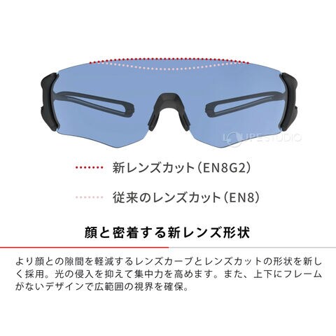 あえて剛性を適度に落とすことでしなやかに頭部を包み込む特?的な8の字構造のテンプルはそのままに、顔との密着度を高めて隙間からの光の侵入を抑えるレンズカーブ及びカット形状を新たに採用。そのメリットはマラソン、トレイルランなどランニング系アクティビティでいかんなく発揮される。