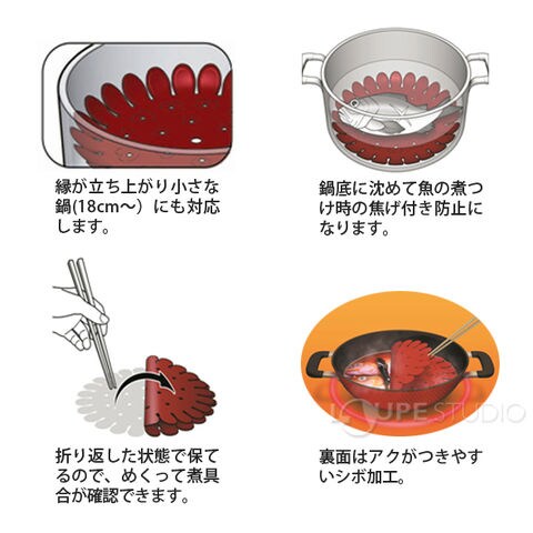 - 鍋底に沈めて魚の煮つけ時の焦げ付き防止になります。