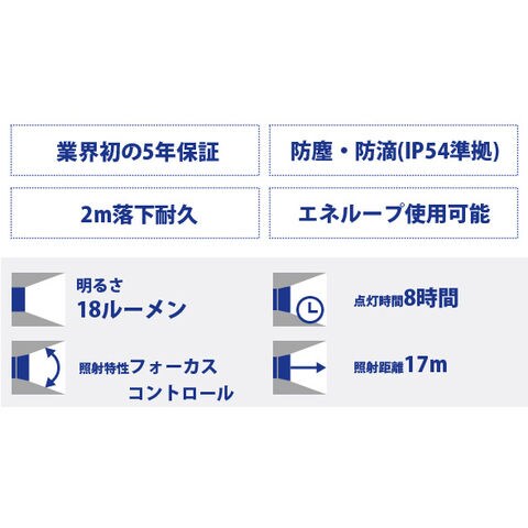- スライドフォーカスシステム:ヘッド部分を前後させることで、片手で簡単に照射角調整をする事ができる。