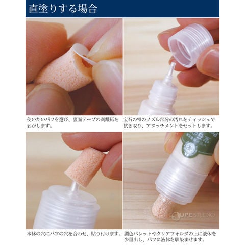 別売りの「宝石の雫専用 ポンポンアタッチメント」を取り付けると、ボトルのままご使用いただけますが、パレット等に宝石の雫を出し、筆やスポンジなどでもお使いいただけます。使用する際には、水で薄めないでお使いください。