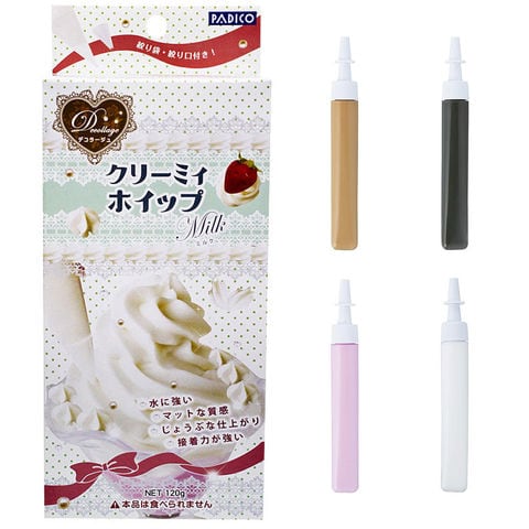ホイップクリームのように絞り口を使ってデコレーションできるクリーム状の粘土です。表面はよりマットな質感で、リアルなホイップクリーム風の装飾ができます。とても柔らかく、乾燥するまでは水に溶けるお手入れの簡単さと、乾燥後の耐水性を持ち合わせています。