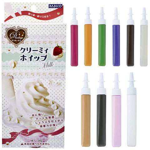 ホイップクリームのように絞り口を使ってデコレーションできるクリーム状の粘土です。表面はよりマットな質感で、リアルなホイップクリーム風の装飾ができます。とても柔らかく、乾燥するまでは水に溶けるお手入れの簡単さと、乾燥後の耐水性を持ち合わせています。
