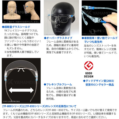 フェイスシールド メガネタイプ 日本製 眼鏡型 保護メガネ 曇らない 曇り止め 女性 男性 メガネの上から めがね マスク 山本光学 超軽量 眼鏡型 医療 YF-800Sスペック