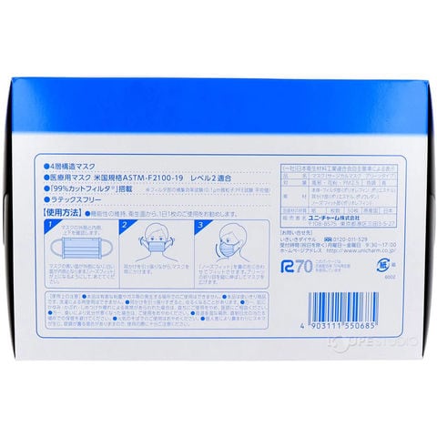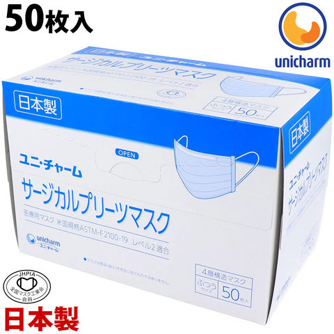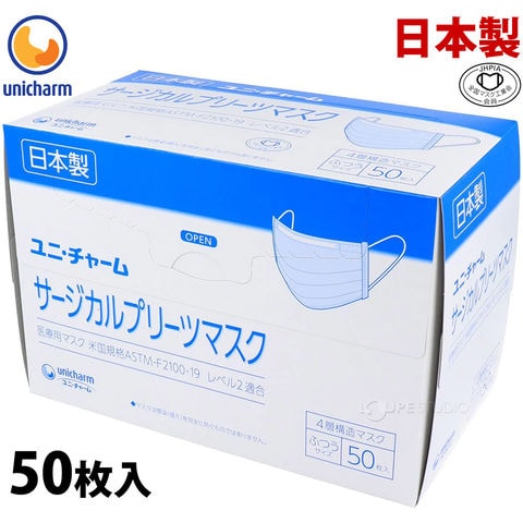 マスク 日本製 不織布 使い捨てマスク ユニチャーム 箱 大容量 ユニ・チャーム サージカル プリーツマスク ふつうサイズ 青 50枚入り 医療用 ウイルス対策スペック