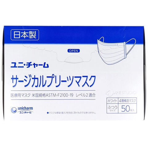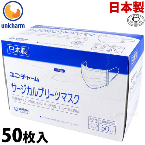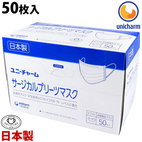 マスク 日本製 不織布 使い捨てマスク ユニチャーム 箱 大容量 ユニ・チャーム サージカルプリーツマスク ふつうサイズ 白 50枚入り 医療用 ウイルス対策スペック
