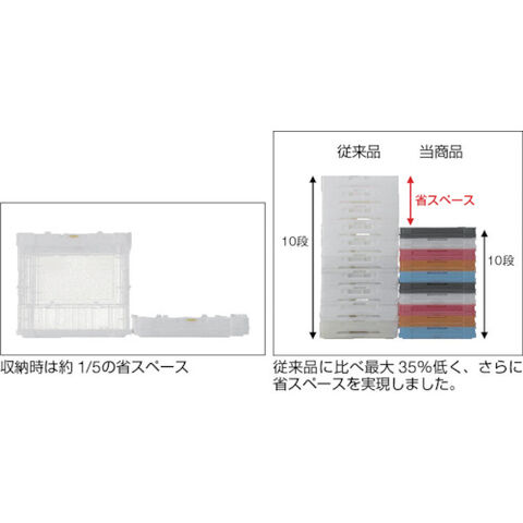• 折りたたんだ時の高さを最大限まで追求、従来タイプに比べて最大35%低く、これにより輸送運賃・保管スペースを大幅に削減することができます。