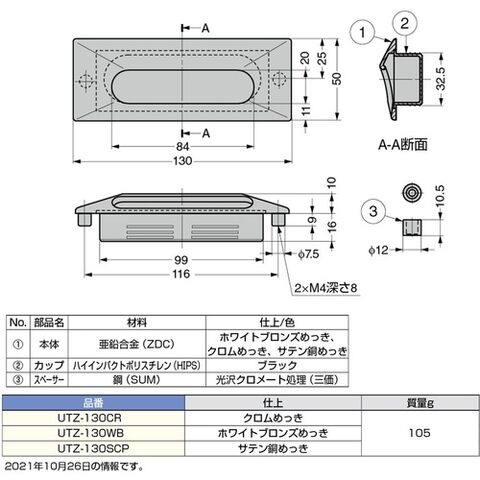 付け替え 部品 取っ手 ハンドル パーツ SUGATSUNE (100010225)UTZ-130WB 埋込取手 UTZ-130型 ホワイトブロンズめっき [UTZ-130WB] 販売単位:1