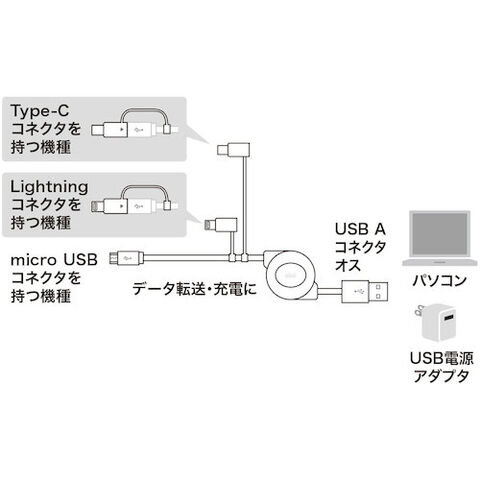 SANWA ライトニング・Type-C・microB巻取り 3in1 USBケーブル 0.8m [KB-IPLTM08KW] KBIPLTM08KW 販売単位:1