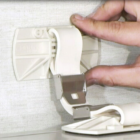 • ゴムベルトの両端に取り付けられた接着パッド付きベースの一方をキャビネット天板に、もう一方を壁面に接着固定して使用します。接着固定なので、キャビネットや壁面への穴あけ工事が不要です。