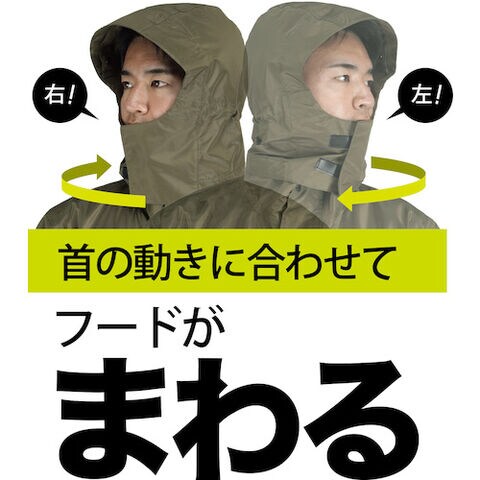 • 首の動きに合わせてフードが回る回転フードが雨の日の作業中の視界を幅広く確保します。