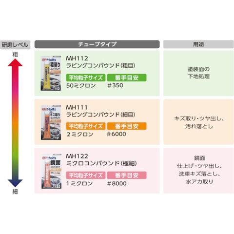 • 細目・極細を順番に使用することで、ペイント補修面のツヤ出しが出来ます。