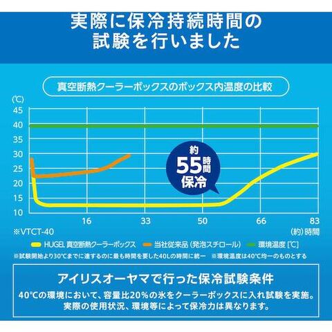 • 【メーカー試験条件】保冷力は40℃の環境において、容量比20%の氷をクーラーボックスに入れ試験を実施。(実際の使用状況、環境等によって保冷力は異なります)