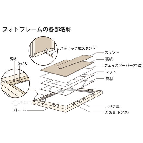 | 仕様 | 壁掛用金具・縦横兼用スタンド・吊ひも付 縦横・掛け置き兼用 マット1枚付 [ポスト判窓寸]142×91mm |