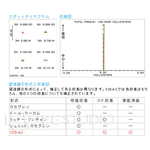 VISAC(VIXEN SIXTHORDER ASPHERICAL CATADIOPYTRIC)には、写野全面での無収差を目指して開発されたビクセンの高精度6次非球面技術が活かされており、コマ収差・球面収差・像面湾曲のすべてが補正されたシャープな像が広がります。フォトビジュアル望遠鏡として、星像は写野42mm最周辺で15ミクロン以下を実現しています。