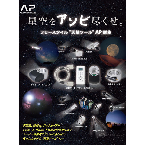 赤経モーターモジュールSBOセット(AP赤道儀の天体追尾用メインモーター(赤経モーターモジュール)および制御コントローラー(STAR BOOK ONE))を標準装備しています。赤経モーターモジュールSBOセットはAPシステムの核心部です。赤経モーターモジュールSBOセットを核として他のモジュールパーツを組み合わせることで、目的に応じたシステムを組むことができます。