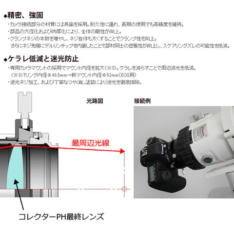 | 対応鏡筒 | ドロチューブまたは接眼部に60mmネジを装備した鏡筒全機種 A81M、A105M、ED81SII、ED103S、ED115S、AX103S、R200SS、VC200L、VMC200L、VMC260L、VMC330L 他 |