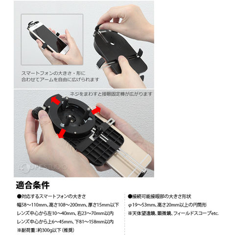 スマートフォン(カメラ付)を天体望遠鏡など光学機器に取付けて撮影できます。適合条件を満たしていればフィーチャーフォンなどスマートフォン以外の端末でも撮影できます。 天体望遠鏡に取付けて月面や惑星の撮影、顕微鏡に取付けてミクロ撮影、フィールドスコープに取付けて野鳥の撮影などがお楽しみいただけます。