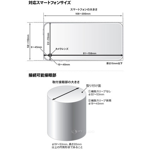 | 対応するスマートフォンの大きさ | 幅58~110mm、高さ108~200mm、厚さ15mm以下 レンズ中心から左10~40mm、右23~70mm以内 レンズ中心から上6~45mm、下81~158mm以内 |