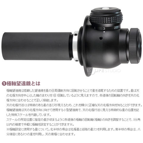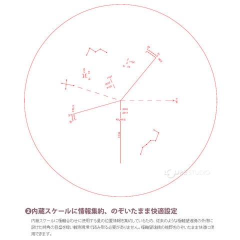 北極星と近隣の星2つ(合計3つ)を内蔵スケールの所定位置に導入することで手軽に3分角以内の精度で極軸を合わせることができます※。