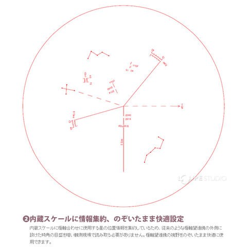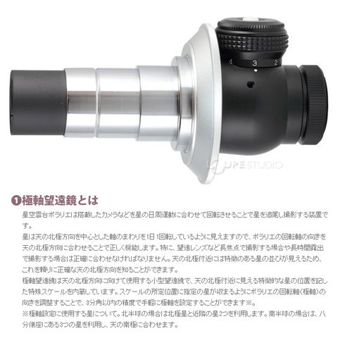 北極星と近隣の星2つ(合計3つ)を内蔵スケールの所定位置に導入することで手軽に3分角以内の精度で極軸を合わせることができます※。