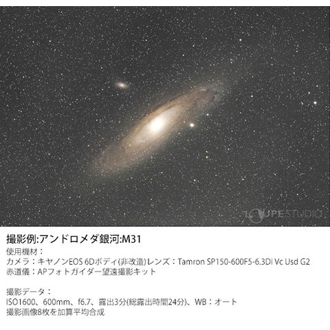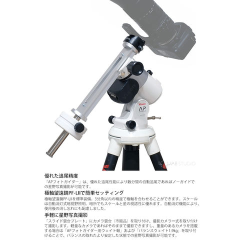 | 付属品 | スライド雲台プレートDD、クイックリリースクランプセット、APフォトガイダー用ウェイト軸、バランスウェイト1.9kg、カラー星空ガイドブック、星座早見盤 |