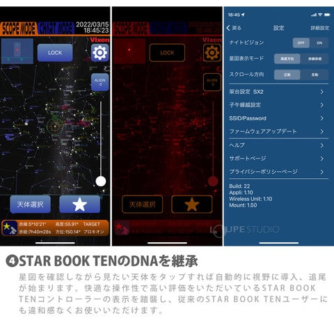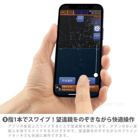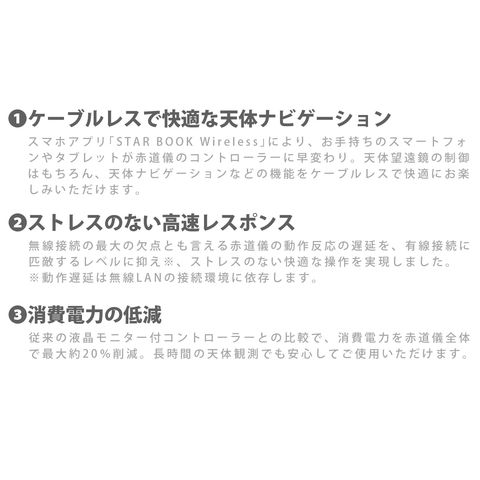 赤道儀に取付けることで、天体望遠鏡を無線で制御できるコントローラーユニットです。スマホアプリ「STAR BOOK Wireless」(無料)により天体ナビゲーションを快適にお楽しみいただけます。