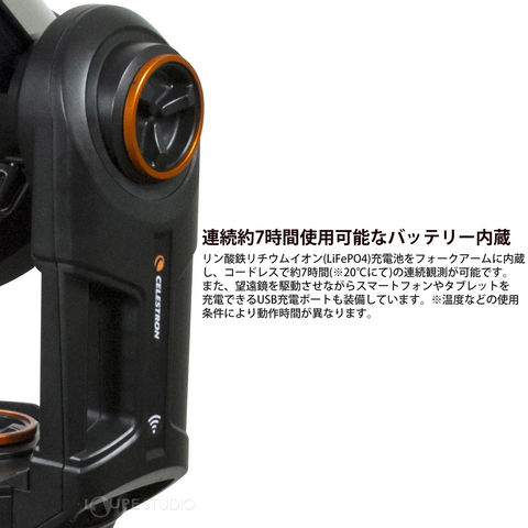 NexStarEvolutionマウントはユーザーのフィードバックにより設計されたNexStar SEシリーズの上位機種で、天体観測に役立つ多彩な機能を搭載しています。フォークアームにリン酸鉄リチウムイオンバッテリー(LiFePO4)充電池を内蔵し、コードレスで約7時間(※20℃にて)の連続観測が可能です。また、望遠鏡を駆動させながらスマートフォンやタブレットを充電できるUSB充電ポートも装備しています。