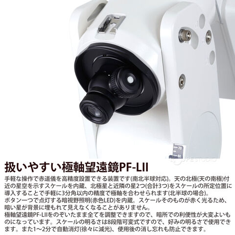 | 極軸望遠鏡 | 倍率・口径・実視界:5倍20mm(実視界10°) スケールパターン:3星導入式 / 歳差補正付(~2040年) 北半球:北極星、δUMi、51Cep / 南半球:σOct、τOct、χOct 視野照明:自動消灯式暗視野照明内蔵(8段調光付) 電源:CR2032電池×1個(モニター電池付属) 据付精度:約3′角以内 |