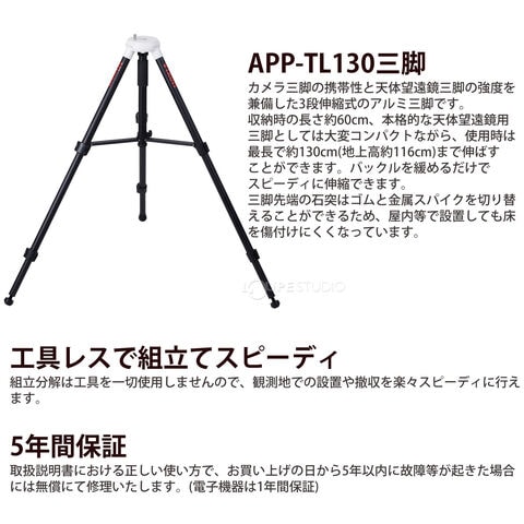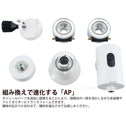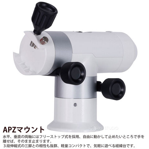「AP」のもっともベーシックな形として、経緯台となるよう各モジュールを組み合わせたAPZマウントに屈折式鏡筒AE81Mを搭載。扱いやすく、エントリーのセットとしておすすめです。