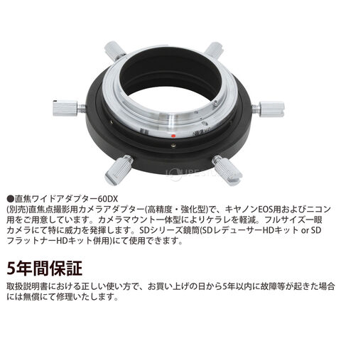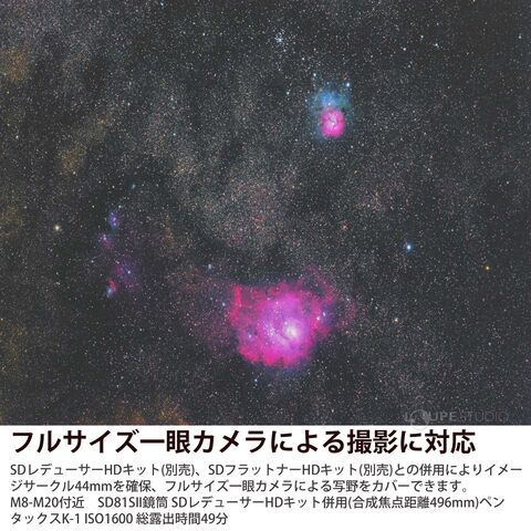 フォトビジュアルなSDアポクロマートのスタンダード鏡筒です。SDレデューサーHDキット(別売)、SDフラットナーHDキット(別売)との併用によりイメージサークル44mmを確保、フルサイズ一眼カメラによる写野をカバーできます。SD81SII鏡筒では、対物レンズ外周部に使用するスペーサーをリング形状に変更。これにより星像の周りに生じる回折光(かいせつこう)が均一となり、より美しい星像が得られ、高品位な天体写真が撮影可能となります。