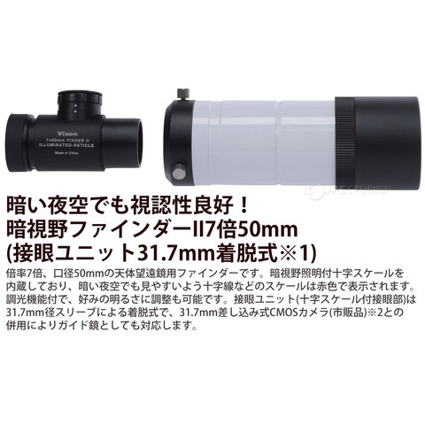 | ファインダー | 暗視野ファインダーII7倍50mm 実視界7.0度(CR2032モニター電池付) |