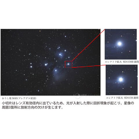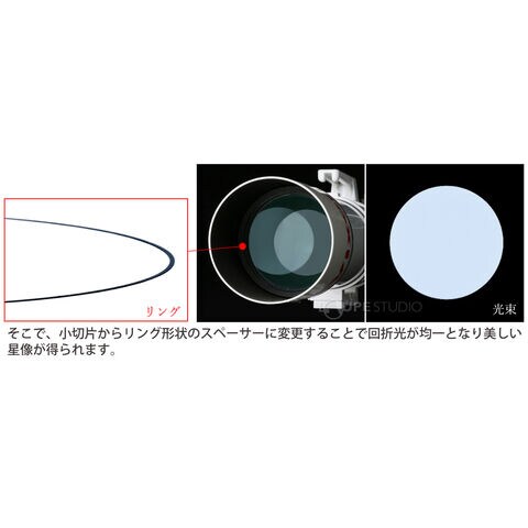 対物レンズ外周部に使用するスペーサーを3枚の切片からリング形状に変更したことで、星像の周りに生じる回折光(かいせつこう)が均一となり、より美しい星像が得られます。