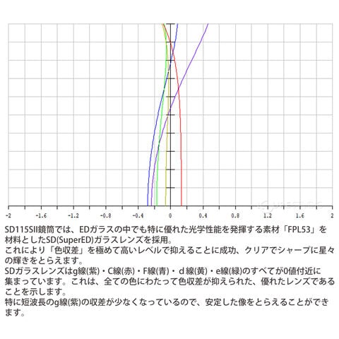 | 対物レンズ | 115mm/SDアポクロマート、マルチコーティングSD(Super ED)ガラスレンズ採用 |