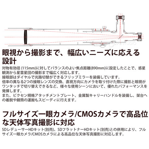 SDレデューサーHDキット(別売)、SDフラットナーHDキット(別売)との併用により、イメージサークル44mmの高性能アストログラフとして、フルサイズ一眼カメラ/CMOSカメラによる写野もカバーします。