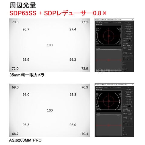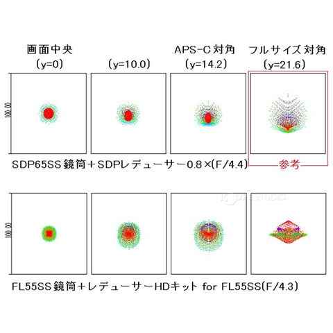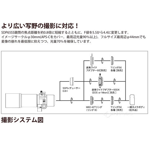 SDP65SS鏡筒の専用レデューサーです。焦点距離を約0.8倍に短縮するとともに、F値を5.5から4.4に変更します。