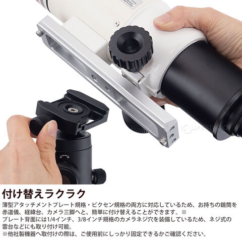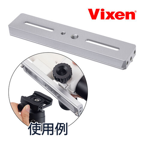 小型鏡筒に取り付けると、ビクセン規格のアリミゾ式赤道儀や経緯台だけでなく、カメラ三脚にもそのまま搭載できるプレートです。