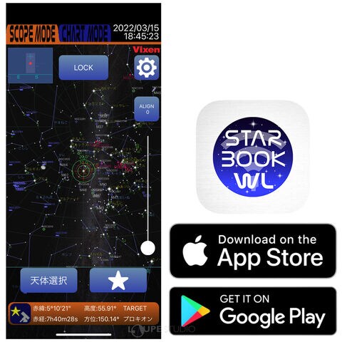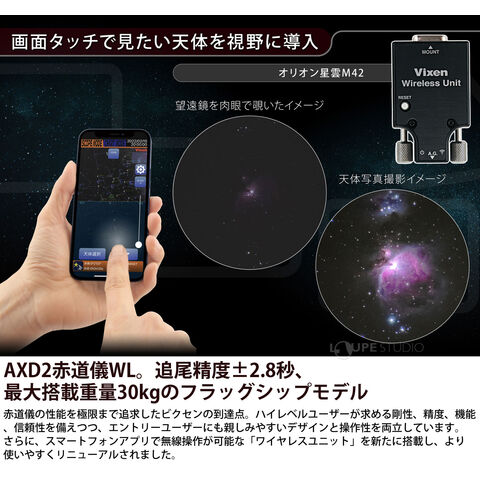 クラス最高の見え味を約束するSDガラスレンズ使用の3枚玉フォトビジュアル鏡筒AX103S、スマートフォンでコントロールできるフラッグシップAXD2赤道儀WLのセットです。