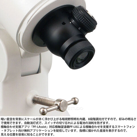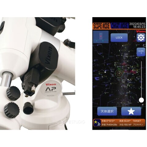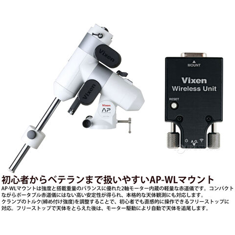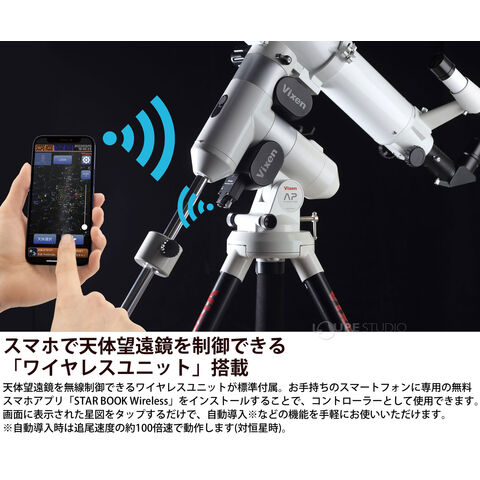 天体望遠鏡を無線制御できるワイヤレスユニットを搭載。お手持ちのスマートフォンから、自動導入・自動追尾など多彩な機能を手軽に使用可能。(専用アプリ使用)コンパクトなモデルで、ベテランのお手軽機材としてはもちろん、赤道儀を初めて使用される方にもお勧めできます。