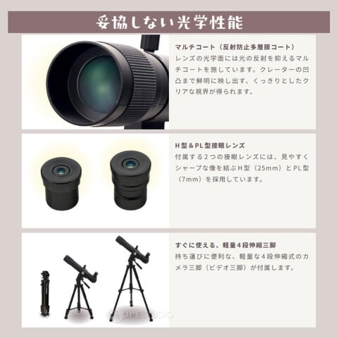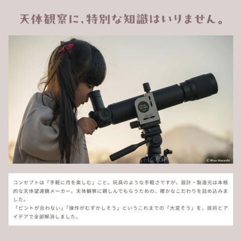 コンセプトは「手軽に月を楽しむ」こと。玩具のような手軽さですが、設計・製造は本格的な望遠鏡メーカー。天体観察に親しんでもらうための、確かなこだわりを詰め込みました。